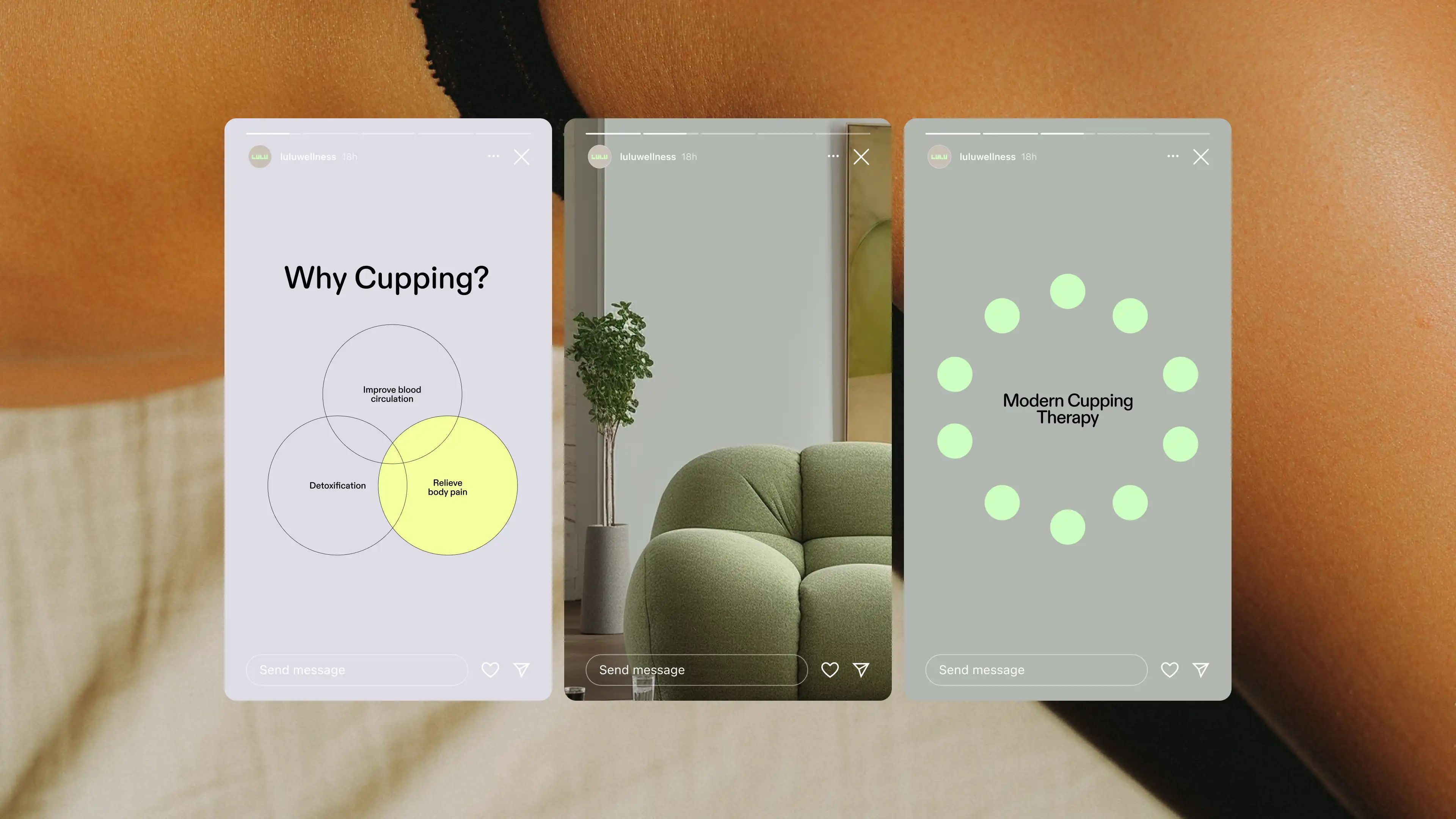 Lulu Wellness’ brand encapsulates its mission of modernizing traditional wellness practices. We enhanced a key visual element, using circular forms reminiscent of cupping marks, and infusing them with a color palette and typography that evoke a sense of calm and healing, while also appearing fresh.